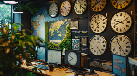 A vibrant office workspace showcasing various clocks, a world map, and computers. The design promotes productivity with a touch of nature, perfect for creative environments.
