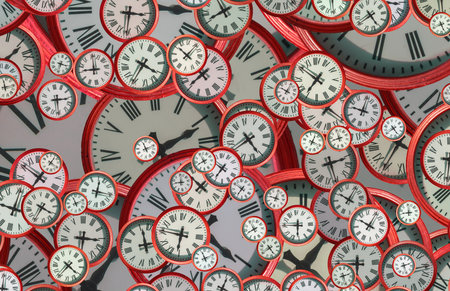 Multiple Clocks on a red background.