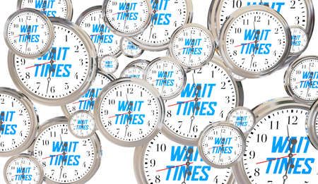 Illustration of people sitting at computers against the backdrop of a large wall with numerous clocks. Deadline concept, time management