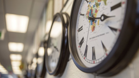 A unique wall of decorative clocks showcasing different time zones, perfect for an office environment. The clocks blend style with functionality, enhancing decor.