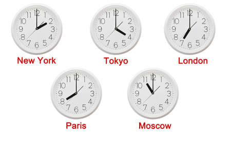 five world clocks on white background (world time)