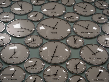 Clocks on wall, symbol for Greenwich Mean Time