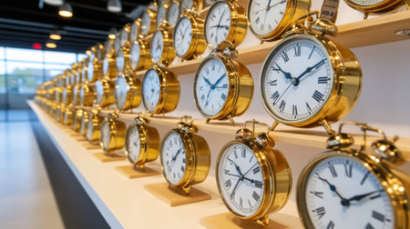 Many clocks are showing different times, creating a visual representation of stress, deadlines, and the challenges of time management in a busy schedule
