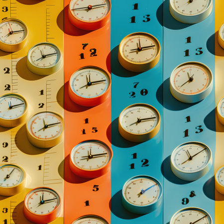 yellow, orange, and blue. The clocks are evenly spaced and appear to be all set to different times, creating a visually interesting pattern.