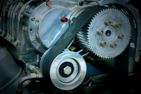 Timing belt and twin camshaft sprocket in engine racing car.