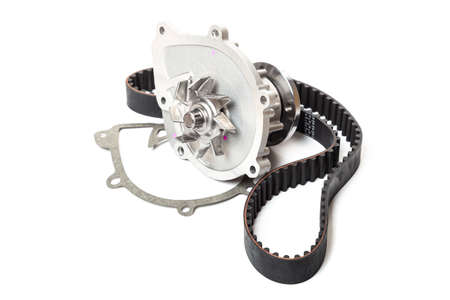 automatic water pump for car and belt isolated on white background. Automobile spare part