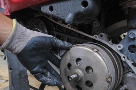 Motorcycle CVT transmission gear fixing enngine close up transport industry