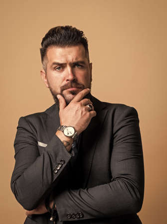 elegant businessman wear formal suit. unshaven stylish guy has groomed hair. male beauty and fashion. mature hipster with beard. business office fashion. brutal caucasian hipster with moustache
