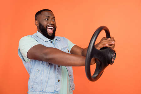Photo of amazed angry african guy dressed jeans waistcoat riding auto beeping isolated orange color background