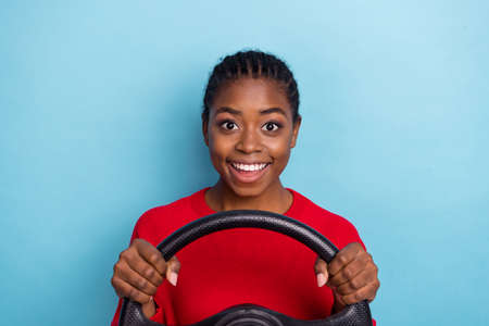 Photo of impressed millennial brunette lady drive car wear red pullover isolated on blue color background