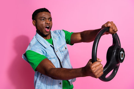 Young man wearing a denim waistcoat and green shirt, holding a steering wheel against a vibrant pink background