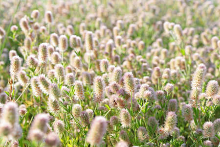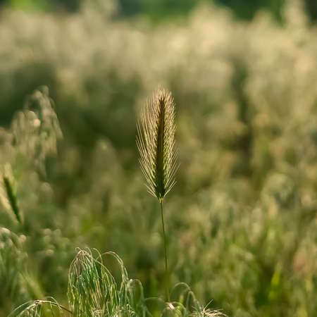 Herbal background. Fluffy grass in the morning sun. Summer meadow. Minimalism, free space for text. Shallow depth of field.
