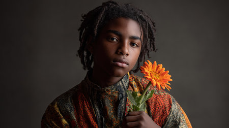 Studio portrait of indigenous youth with orange flower, quiet dignity and hopeful presence