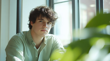 A young man with soft features and wavy dark hair sits in a bright and modern interior. Sunlight streams in through the windows as he smiles gently, surrounded by greenery.