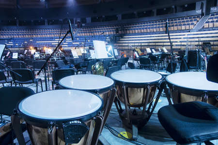 The stage is ready for the orchestra. Musical instruments, score, microphones.