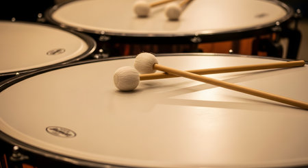 A close-up view of orchestral timpani drums with a pair of soft mallets resting on the drumhead. The warm lighting highlights the texture of the instrument, evoking the atmosphere of a classical music concert or rehearsal.