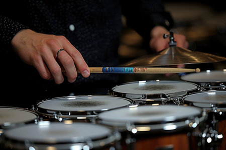 Close-up of a Drummer's Hand Holding a Drumstick Over a Drum Set