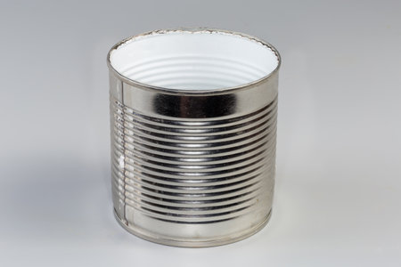 Empty tin can from under a canned food, lined with white plastic film on the inside which was opened with can opener on a gray background