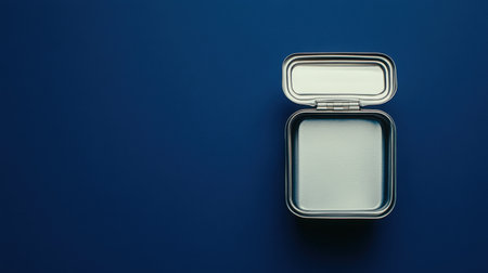 This image showcases a minimalist square metal container with an open lid, positioned on a deep blue background, emphasizing simplicity and organization.