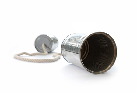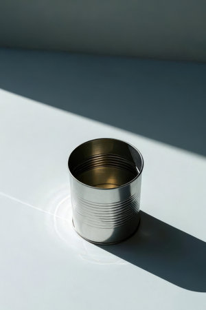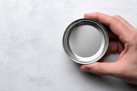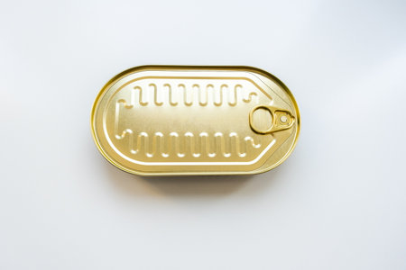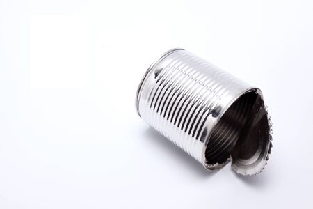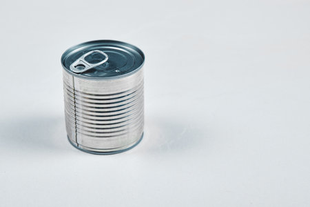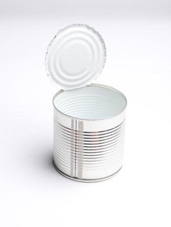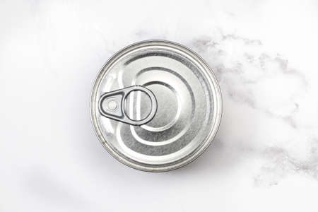One open aluminum metal canned food on a white table. Copy, empty space for text.