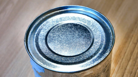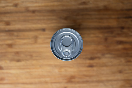 A blank, sealed tin metal food can on a wooden kitchen board. Close up shot, selective focus, no people
