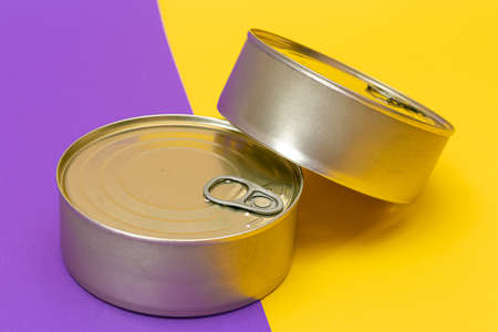 A Group of Stacked Tin Cans with Blank Edges on Split Yellow and Violet Background. Canned Food. Different Aluminum Cans for Safe and Long Term Storage of Food. Steel Sealed Food Storage Containers