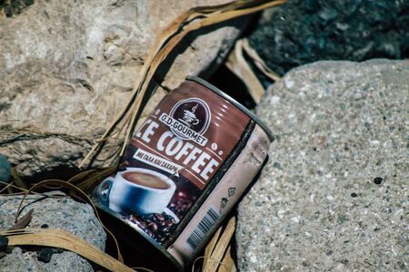 Limassol Cyprus June 12, 2020 Closeup of various pollution of metallic and plastic waste found on one of the natural beaches near the town of Limassol in Cyprus
