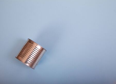 A tin can of golden color in close-up on a blue background. Long-term storage products.