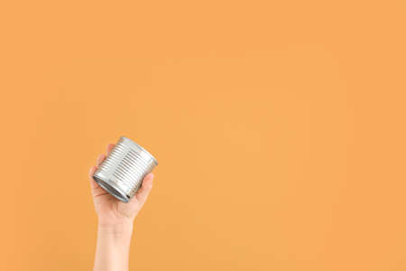 Unopened Tin Can with Blank Edge on Orange Background. Canned Food. Aluminum Can for Safe and Long Term Storage of Food. Steel Sealed Food Storage Container