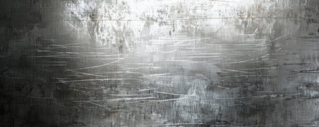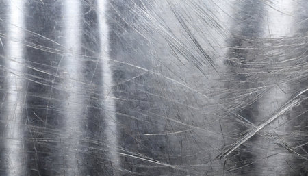 Metallic background with a brushed silver texture, reflecting soft ambient light, and scattered industrial scratches creating a rugged, utilitarian aesthetic. Ideal for high-tech or industrial-themed designs.