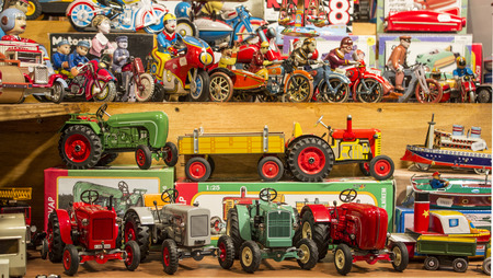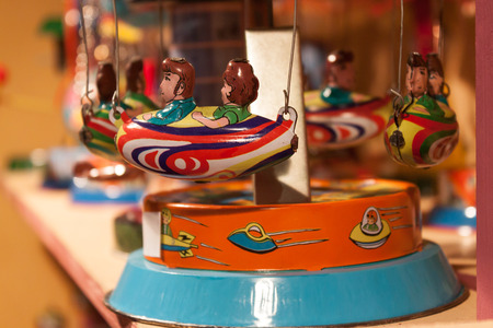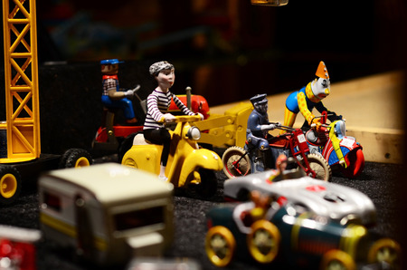 MILAN, ITALY - SEPTEMBER 13: Vintage tinplate toys on display at HOMI, home international show and point of reference for all those in the sector of interior design on SEPTEMBER 13, 2014 in Milan.