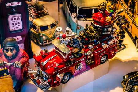 Model of retro fire engine or fire track on the shelf. Miniatures of colorful vintage vehicles in the shop. Turkey, Istanbul, 2019-08-18