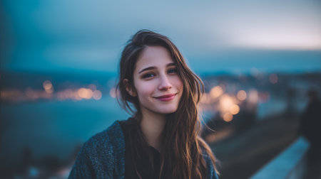 A young woman with long, brown hair smiles gently at the camera. She is wearing a dark sweater and is outdoors at dusk, with blurred city lights in the background.