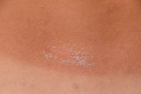 Sunburn on the skin of the back. Exfoliation, skin peels off. Dangerous sun tan.