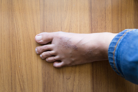 Allergic reaction on the leg. Rash on the foot. Dermatological disease. Pimples on the leg