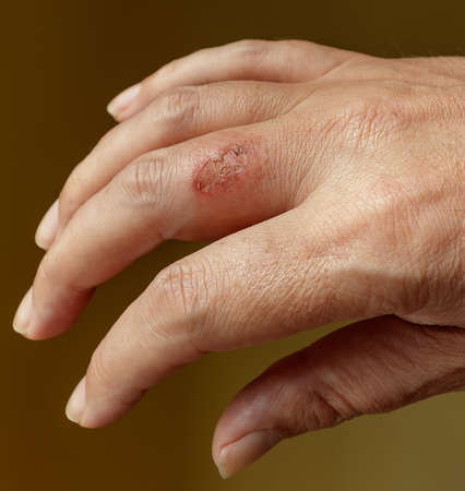 Skin disease for many people - eczema on hand and finger. White copy space for ideas or text.