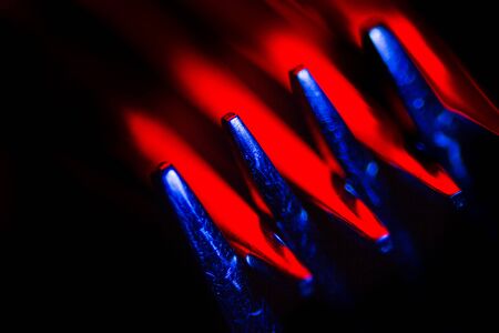 Two forks in colorful illumination macro shot creating an abstract composition. Image is suitable as a background.