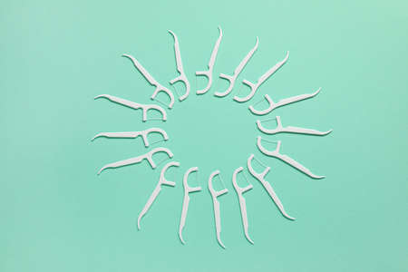 Floss toothpicks on turquoise background, closeup