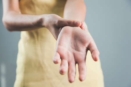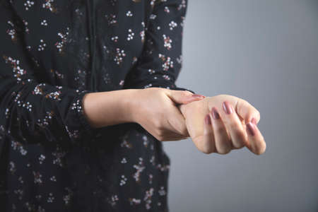 young woman ache hand on gray background
