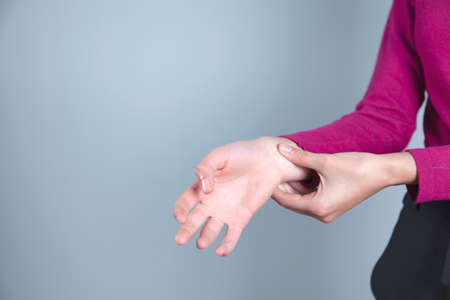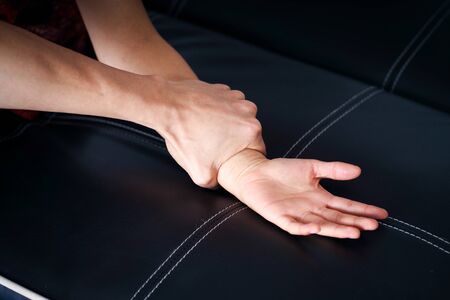Woman pain at wrist, arm and hand ,take the pulse