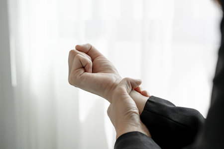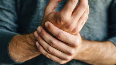 Experiencing discomfort in wrist can be common issue, often caused by repetitive strain or injury. This depicts person holding their wrist, indicating potential pain or discomfort