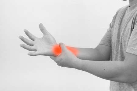 Joint and elbow injuries, fatigue at work. Area of the injury, the image on a clean background. Spasm on the man's wrist.