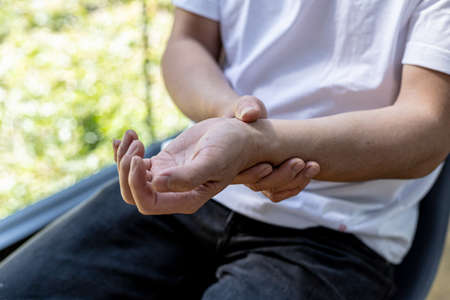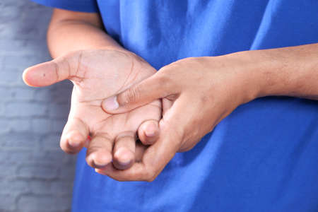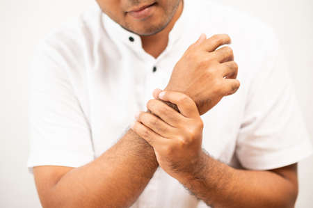 Close up male hand get hurt and pain in hand, wrist. Symptom office syndrome. He has symptom stress in his hand stiffness causing inconvenience.