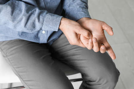 Man suffering from trigger finger indoors, closeup