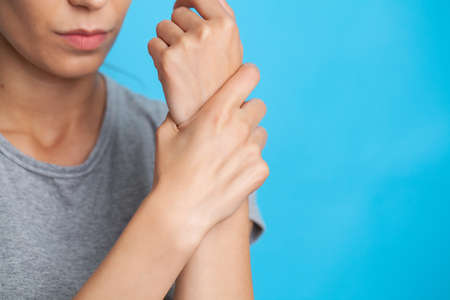 Woman suffering from pain in wrist. Pain in a women wrist. Young woman holding her painful wrist on wall background.