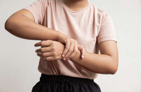 Woman having itchy and scratching her hand