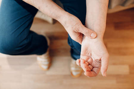 An elderly woman squeezing her wrist due to pain. Concept of health problems in the elderly.