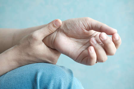 Woman suffering from hand pain or finger pain. Hand numbness or limb numbness. Massaging painful hand