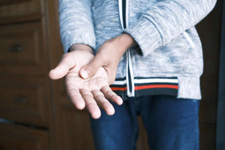 Closeup of body asian thai people with hand injury, palm, bone joint pain finger