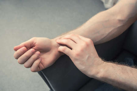 Man scratch oneself, dry flaky skin on hand with psoriasis vulgaris, eczema and other skin conditions like fungus, plaque, rash and patches.